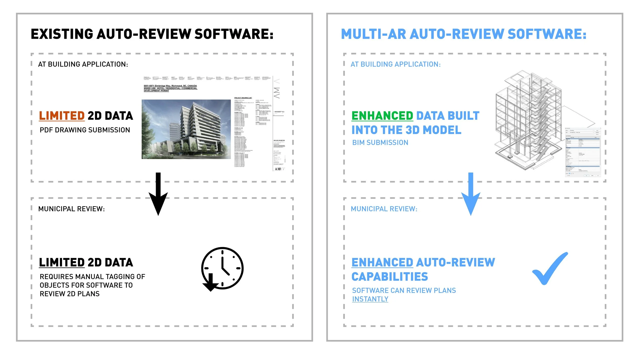 Currently existing auto-review software is based on 2D drawing data, greatly limiting its auto-review capabilities. By using BIM submissions, with enhanced 3D data built directly into the model, automated review software can review applications instantly and reliably.